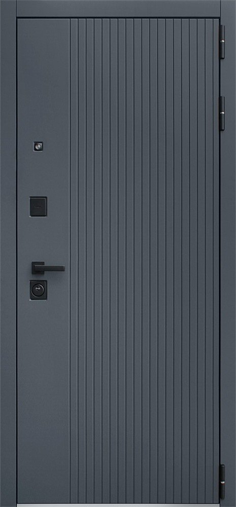 Порошковое покрытие "муар черный". Экошпонированная панель МДФ 10 мм. Линейная фрезеровка. Цвет "графит". Наличник МДФ гладкий 80 мм. Цвет "графит".